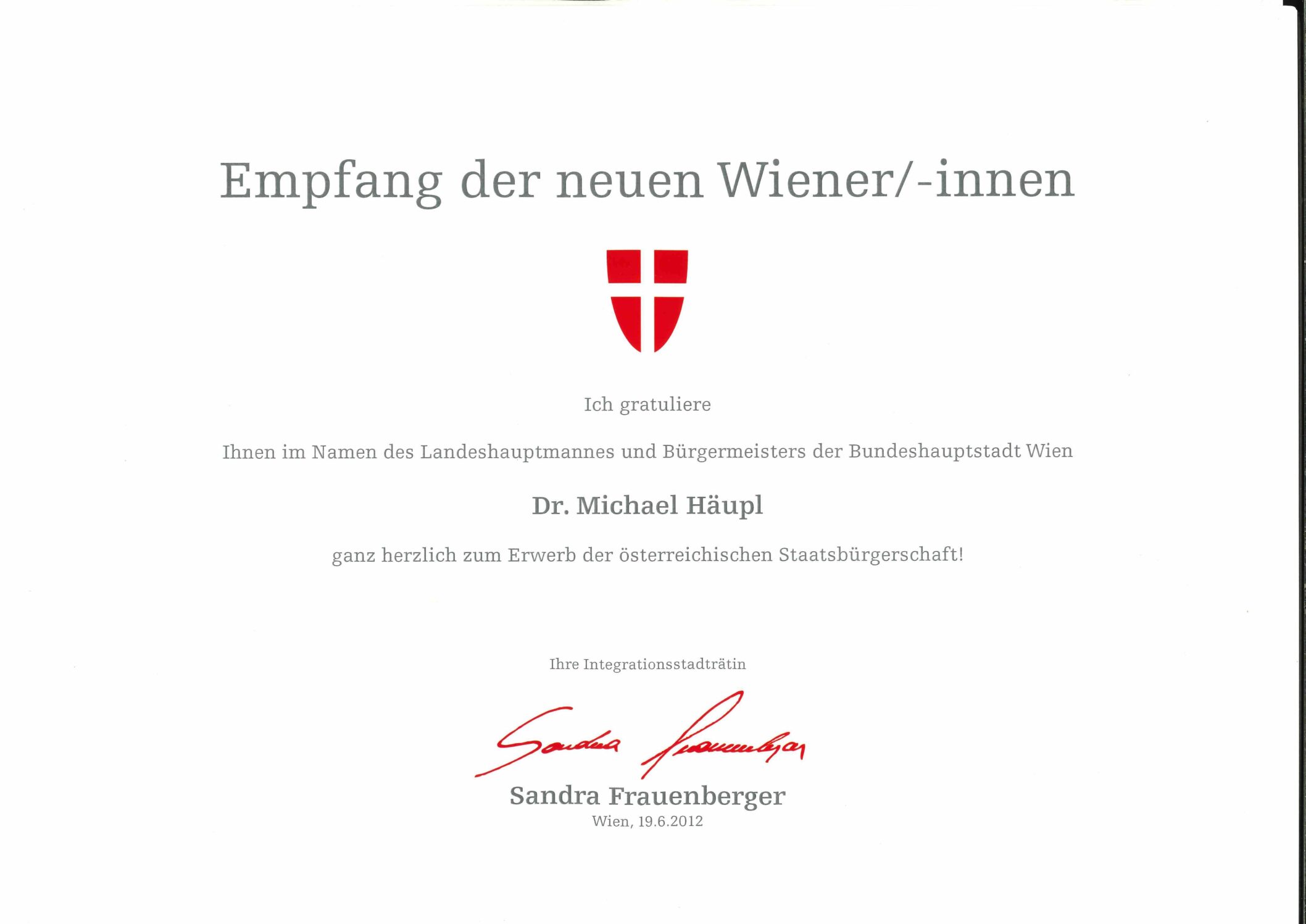 Felicitación del alcalde por ocasión de la entrega de la nacionalidad