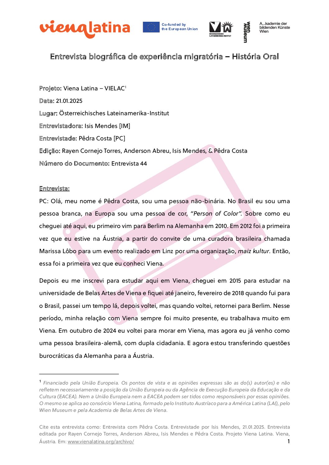 Entrevista biográfica con Pêdra Costa